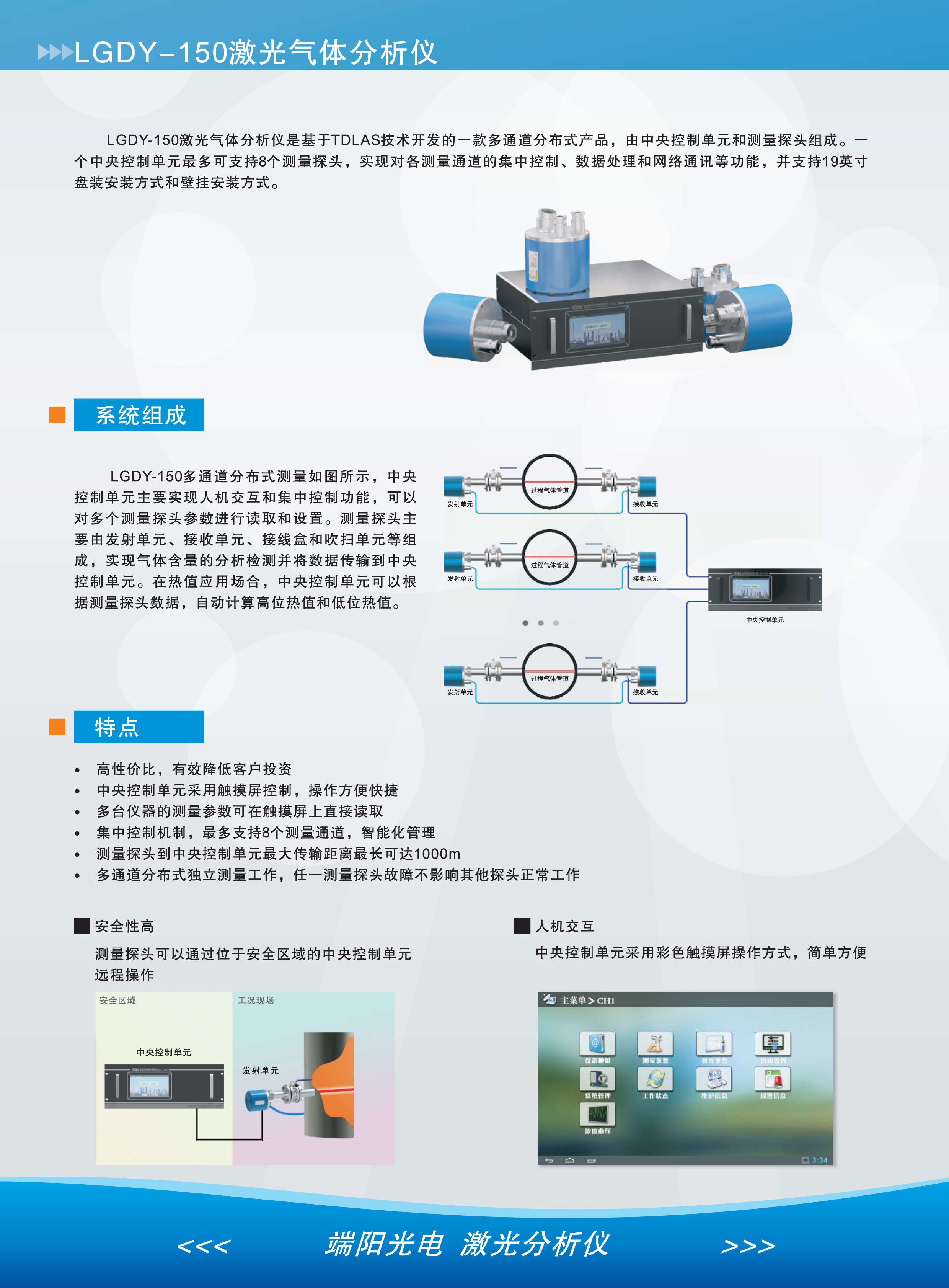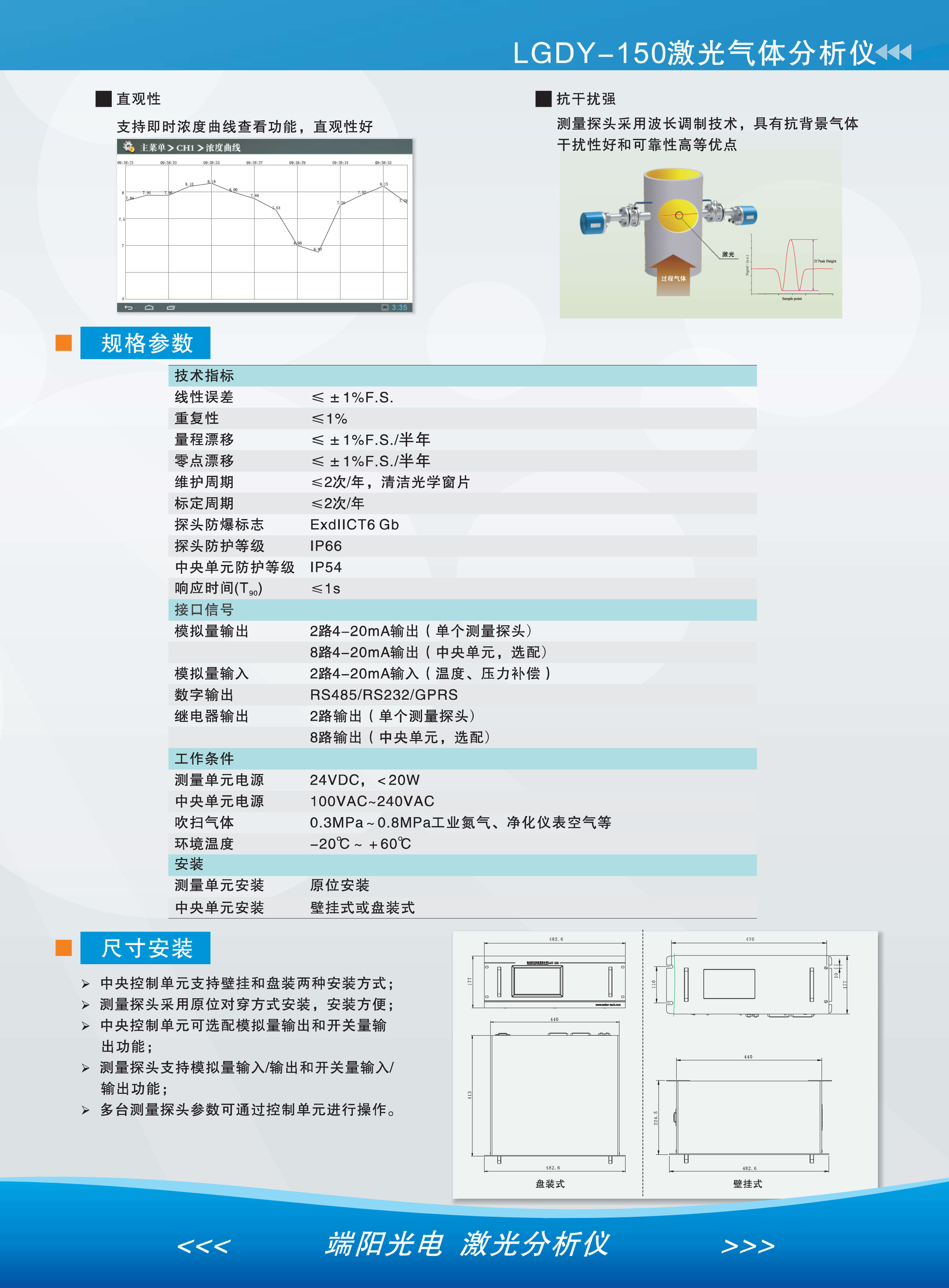 LGDY-150激光气体分析仪是基于TDLAS技术开发的一款多通道分布式产品,由中央控制单元和测量探头组成。一个中央控制单元最多可支持8个测量探头,实现对各测量通道的集中控制、数据处理和网络通讯等功能,并支持19英寸盘装安装方式和壁挂安装方式。