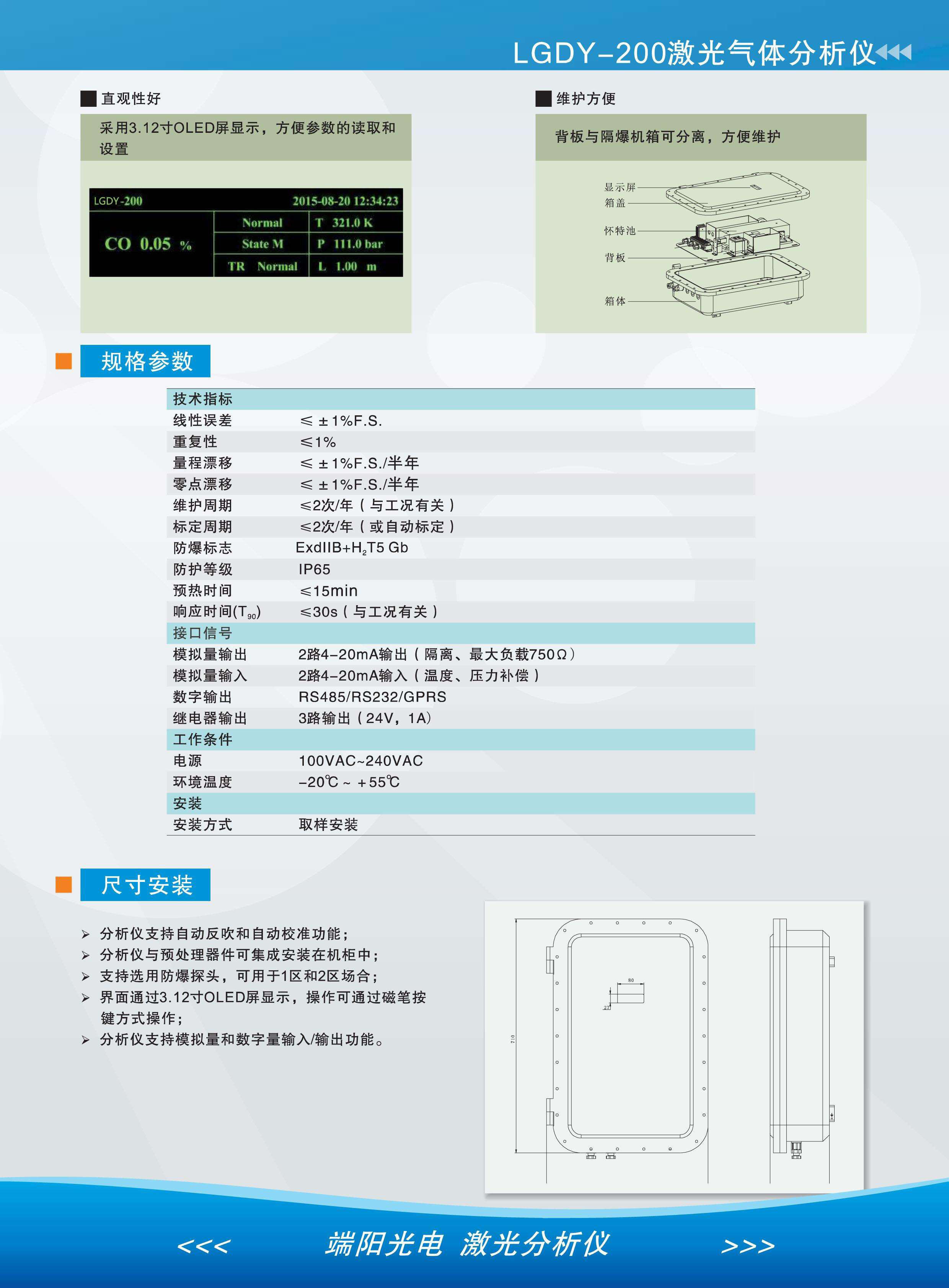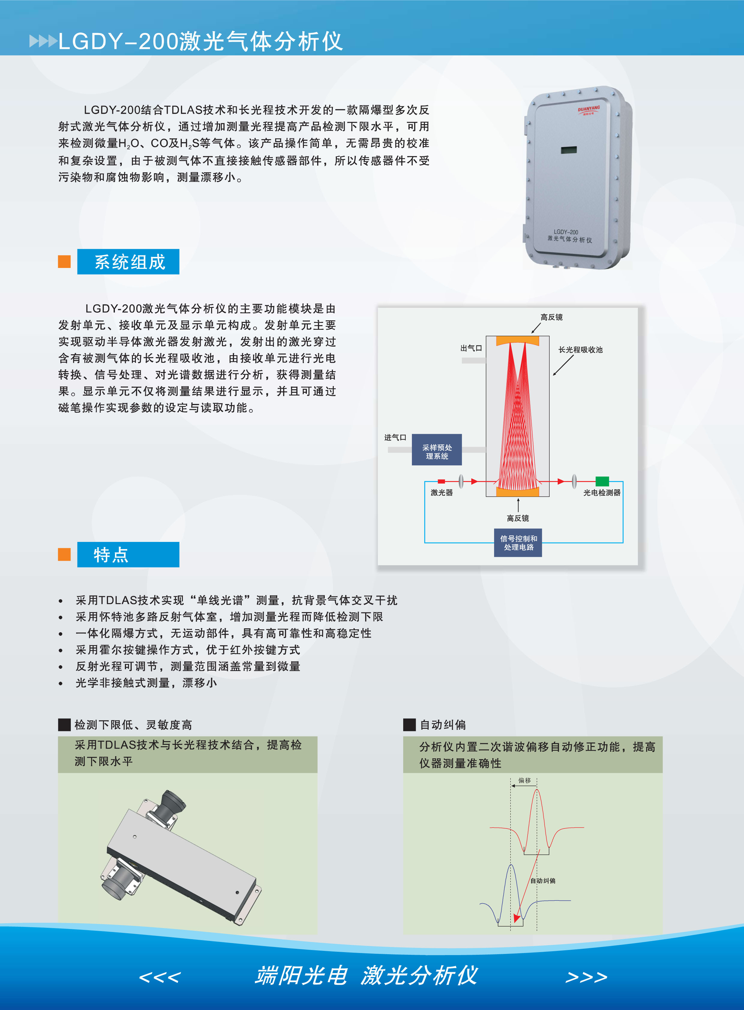 作者:端阳光电 发布时间:2018-05-17 14:19:07 人气:LGDY-200结合TDLAS技术和长光程技术开发的一款隔爆型多次反射式激光气体分析仪,通过增加测量光程提高产品检测下限水平,可用来检测微量H2O、CO及H2S等气体。该产品操作简单,无需昂贵的校准和复杂设置,由于被测气体不直接接触传感器部件,所以传感器件不受污染物和腐蚀物影响,测量漂移小。